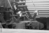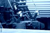 Powerful lights of old locomotive stands on the railroad tracks on the day of the railwayman.