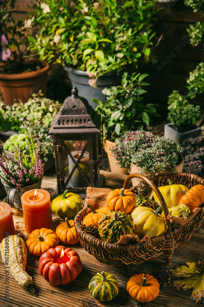 Autumn terrace and patio decoration with pumpkins, lantern, plants and flowers
