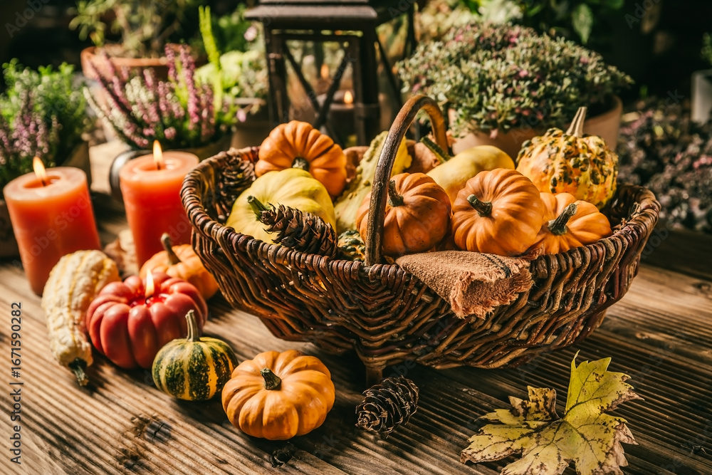 Autumn terrace and patio decoration with pumpkins, lantern, plants and flowers