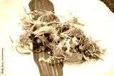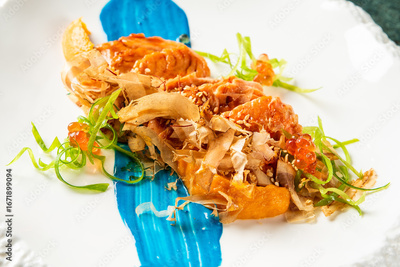 Gourmet salmon dish with sesame seeds, roe, bonito flakes, microgreens, and citrus garnish on white plate with blue sauce, styled on dark green background