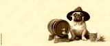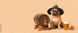 Cute bulldog with barrel and mug of beer on beige background with space for text. Octoberfest celebration
