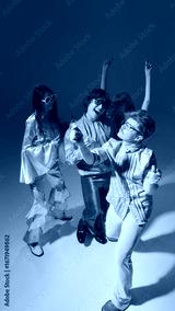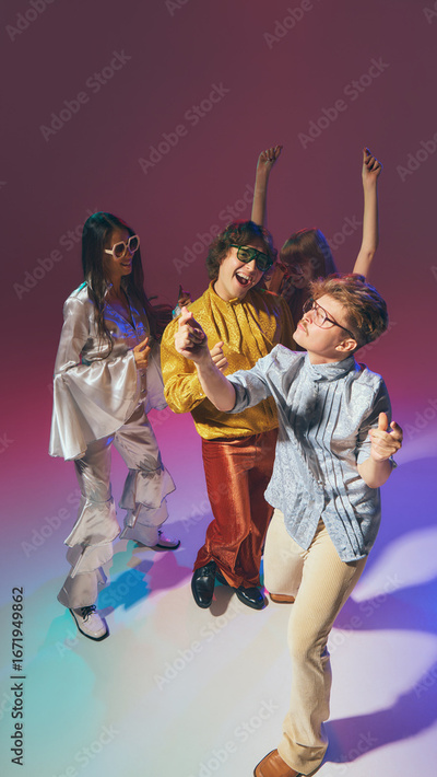 Group of friends dancing in vintage disco outfits under colorful lights. Concept of retro fashion parties, pop culture nostalgia, and fun lifestyle branding.