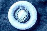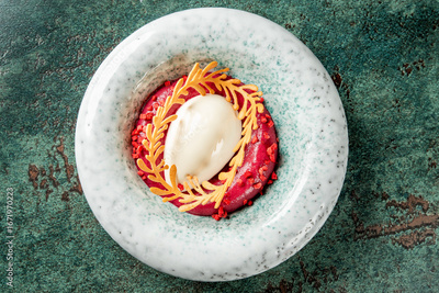 Gourmet dessert with berry mousse, white sorbet quenelle, golden tuile garnish, and red crumble, served on a ceramic plate. Artistic fine dining presentation