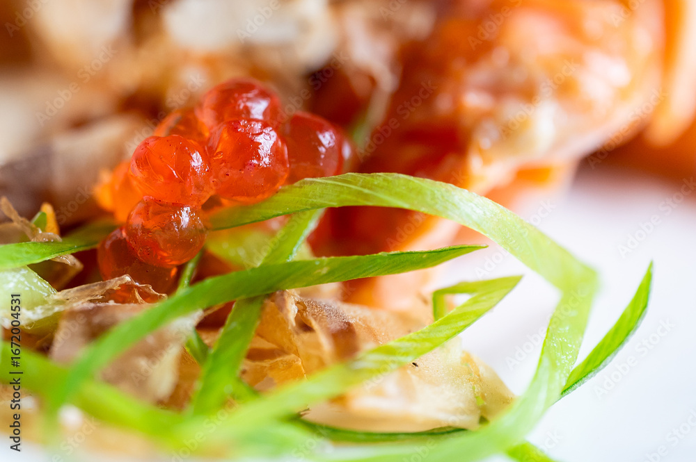 Close-up of Japanese cuisine with salmon roe, scallions, bonito flakes, and salmon sashimi. Fresh ingredients, vibrant colors, gourmet presentation