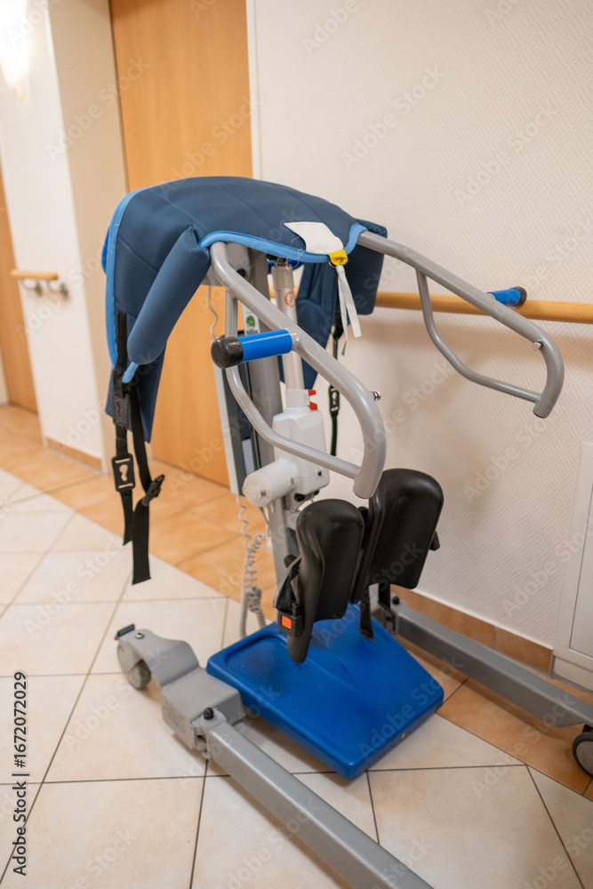 modern rehabilitation walking machine with padded support, foot platforms, Medical lift for immobile person standing alone by wall, aging, disability, nursing home, healthcare equipment, senior care