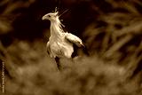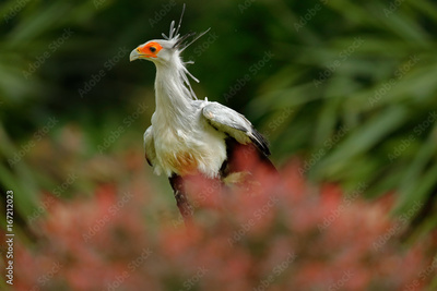 Secretary Bird, Sagittarius serpentarius, Portrait of nice grey bird of prey with orange face, Botswana, Africa. Wildlife scene from nature. Secretary Bird walking in red flowers. Birdwatching in Asia