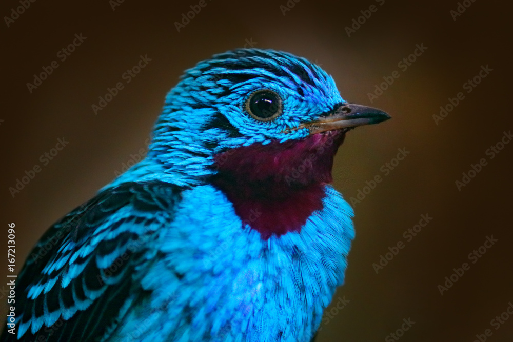 Spangled Cotinga, Cotinga cayana, detail portrait of exotic rare tropic bird in the nature habitat, dark green forest, Amazon, Brazil. Wildlife scene from jungle. Blue bird in dark green vegetation.