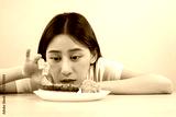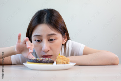 Asian woman staring at fried chicken and donut with hesitation, representing diet struggle, food temptation and healthy eating challenge. Ideal for concepts of nutrition decisions and weight control.