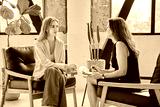Young woman in psychology session talking with professional therapist, mental specialist.