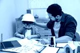Choice of profession. Father and his son at table with laptop and engineering drawings indoors