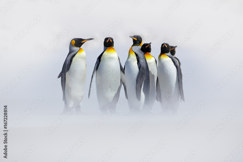 Penguins in the snow. Group of King penguins coming to sea beach with wave a blue sky. Birds on the beach. Funny penguins image. Wildlife nature scene from Antarctica. Penguins with ocean.