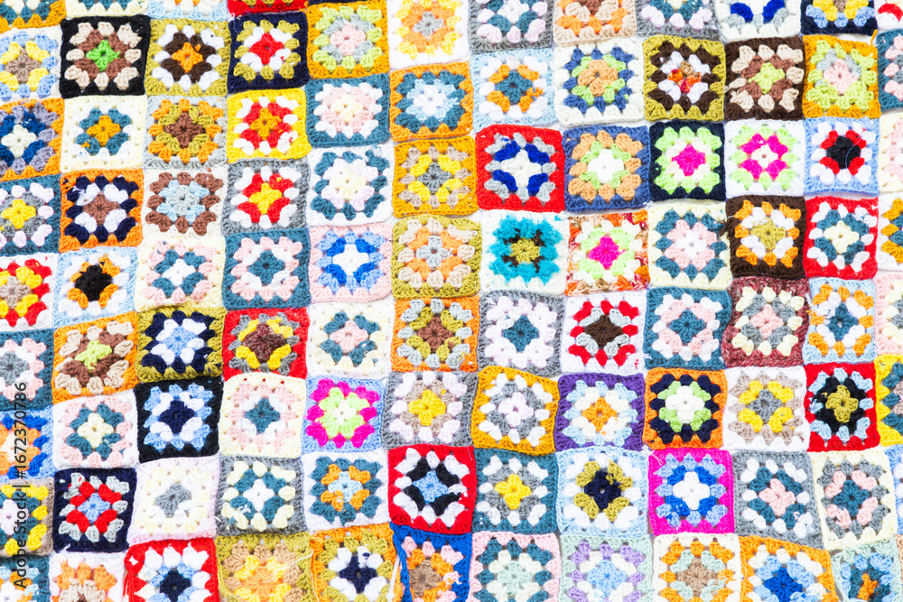 Multi colored blanket in wool, square geometric background, retro decorative pattern