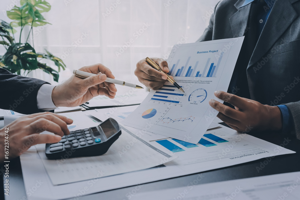 Accounting company provide finance and taxation planning for profitable cash flow, Auditor and accountant team working in office, analyze financial data and accounting record with calculator.Insight