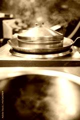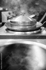 Steam rises from a covered metal pan on a stovetop in a professional kitchen. Stainless steel surfaces and blurred equipment suggest active cooking in a commercial setting