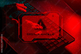 Cyber Attack system hacked concept. Hacker hands typing on a keyboard with a glowing red warning sign System HACKED.