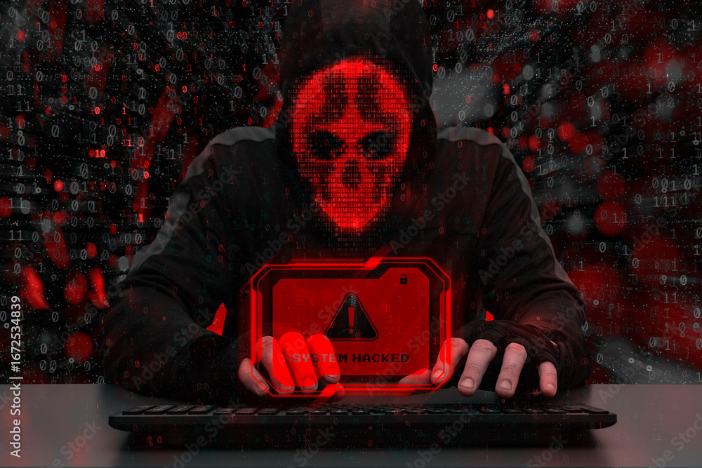 Masked hacker behind a computer with a red warning System hacked. Concept of cybersecurity threat, attacks on data and online systems.