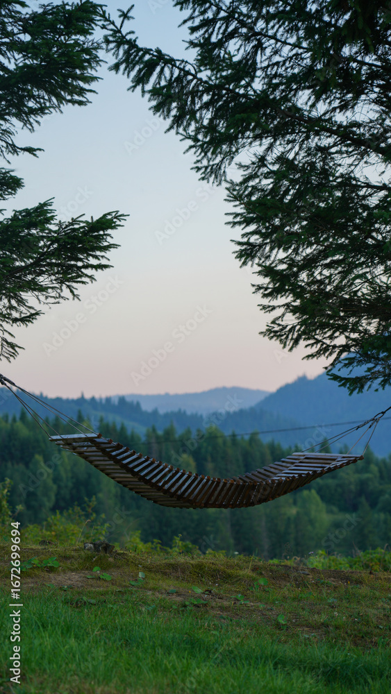 Wooden hanged Hammock between trees with mountain view