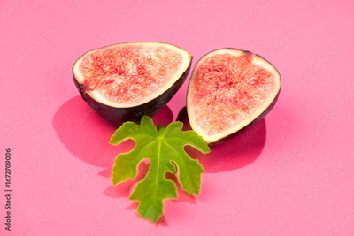Fig fruits. Ripe sweet fresh figs fruit with leaf close up, on pink background, half of bio ripe Mediterranean fig, sliced. Art design