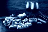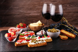 Italian antipasti wine snacks set. Cheese variety, Mediterranean olives, pickles, Prosciutto di Parma, tomatoes and wine in glasses. Spanish tapas