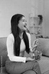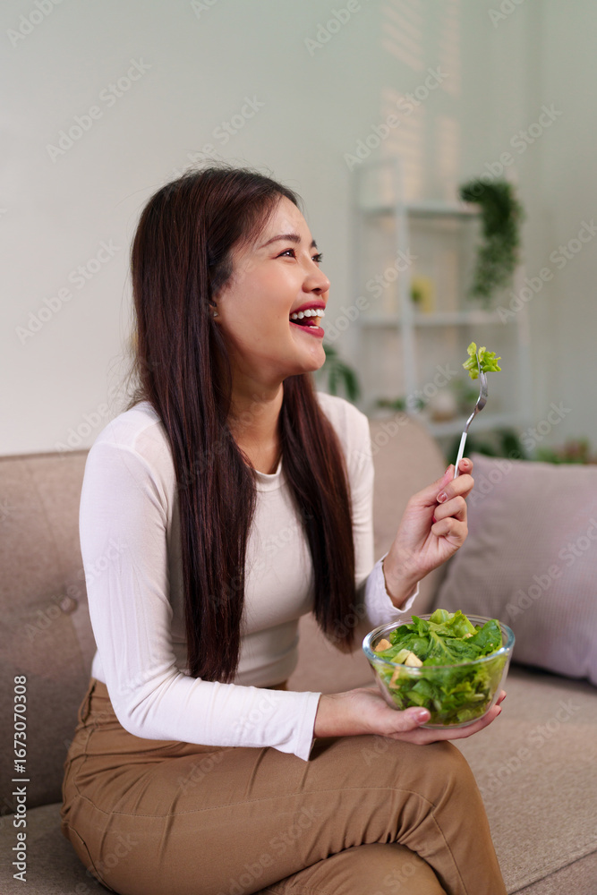 Asian woman enjoys fresh green salad healthy meal happy smiling couch home living room wellness lifestyle nutrition