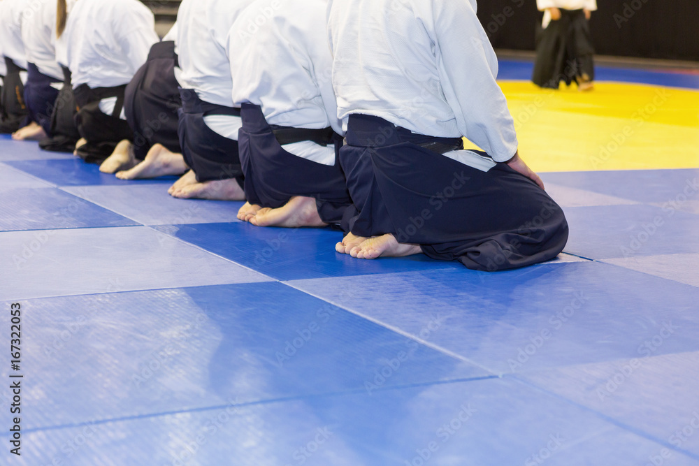 People in kimono and hakama sitting in a line on tatami. Selective focus