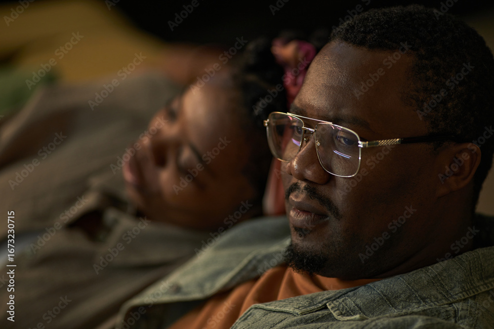 Black man with glasses sitting closely with Black woman resting head on his shoulder, both appearing relaxed, man looking away from camera, indoor moment captured