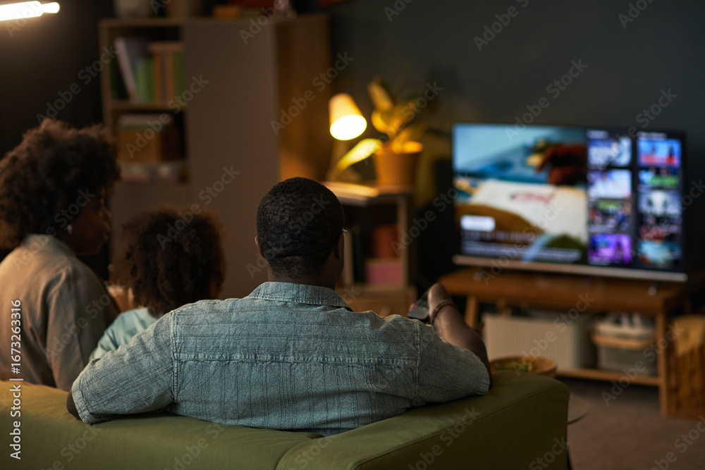 Black man, Black woman, and child sitting on sofa watching television together in living room, remote control in man's hand, family spending leisure time