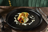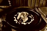 Cauliflower steak in creamy sauce, moody lighting, overhead restaurant composition