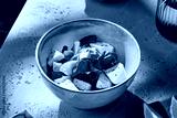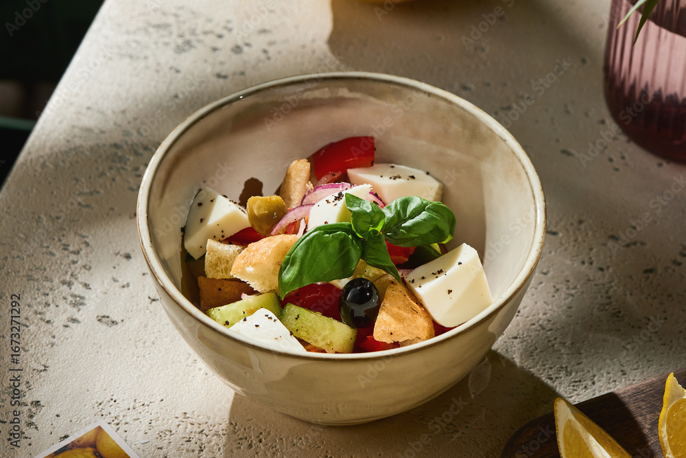 Panzanella salad with tomatoes, cheese, croutons, bright lighting, overhead composition