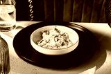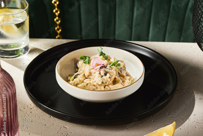 Mushroom risotto in white bowl, bright lighting, overhead minimal composition