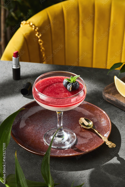 Berry panna cotta with blueberry garnish in bright lighting, overhead restaurant composition