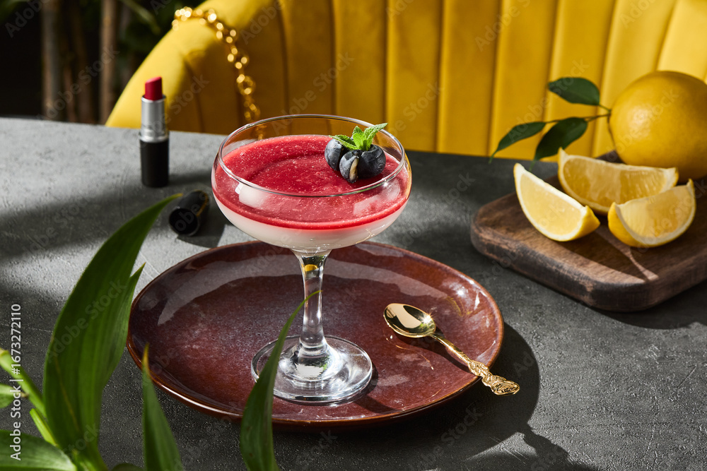 Berry panna cotta with glossy coulis, bright sunlight, overhead composition for contemporary settings