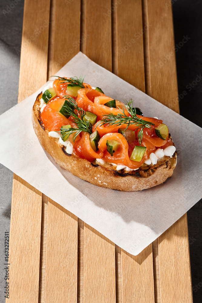 Bruschetta with salmon, creamy cheese, and cucumber in bright natural lighting, overhead composition