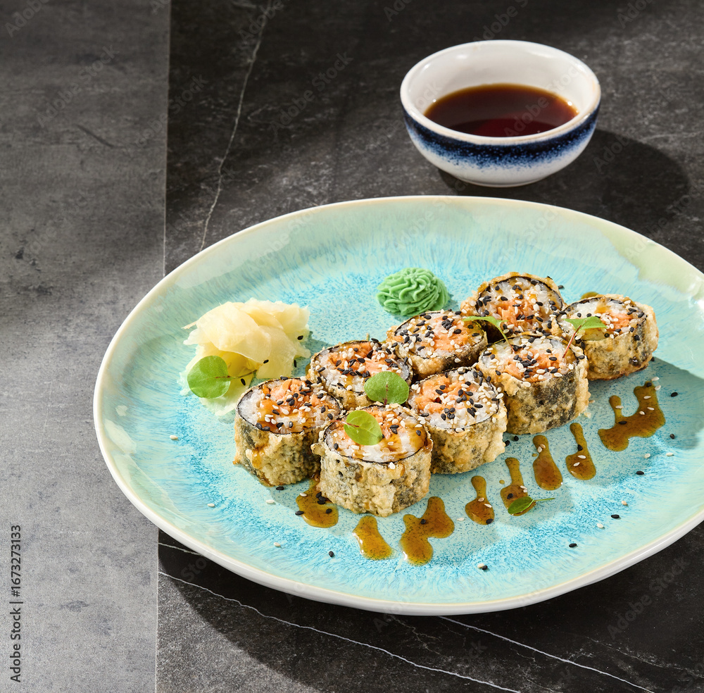 Tempura salmon maki roll with spicy sauce, bright lighting, overhead composition