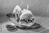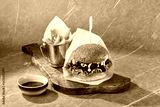 Beef burger with bbq sauce, bright mood, flatlay on marble background