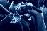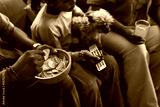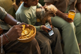 Black child sitting with Black adults on sofa, holding small dog and TV remote, eating potato chips from bowl, drinking orange beverage, watching television together