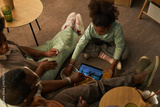 Black girl sitting on floor with two Black adults sharing snacks and watching tablet together, all focused on screen, casual family bonding moment in relaxed home setting
