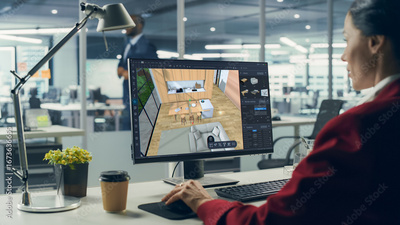 Female Interior Designer Using Advanced 3D Modeling Software on a Desktop Computer to Create a Modern Living Room and Bedroom Space Layout. Specialist Creating a Stylish Environment for a Client