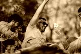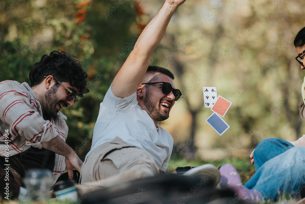 A group of friends enjoying a sunny day outdoors, laughing and playing cards on a picnic. The cheerful and relaxed atmosphere highlights joy and camaraderie.