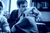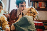 A heartwarming moment featuring a couple embracing in a warm, cozy, home interior while sharing loving affection, surrounded by a friendly atmosphere and gentle natural light from nearby windows.