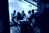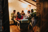 A warm gathering of friends sharing artistic and creative activities in a comfortable interior space, fostering community and enjoyment.