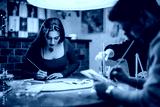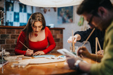 Group of friends engaged in drawing and painting, enjoying creativity and bonding in a warm and welcoming environment. The image expresses the joy of creating art and sharing moments together.