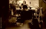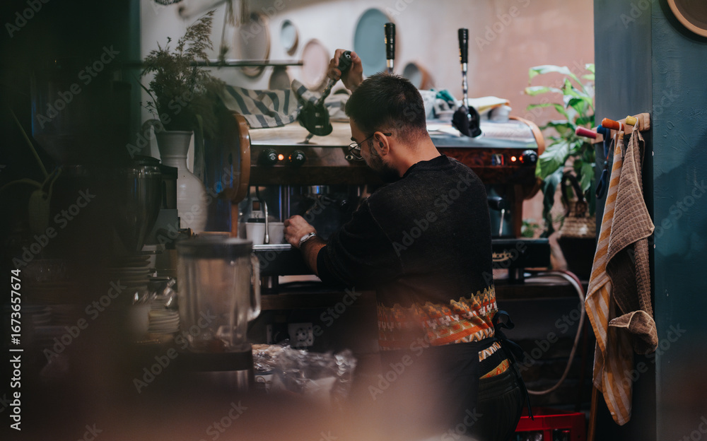 Barista operating a coffee machine in an intimate, stylish cafe featuring artistic decor, greenery, and warm lighting.