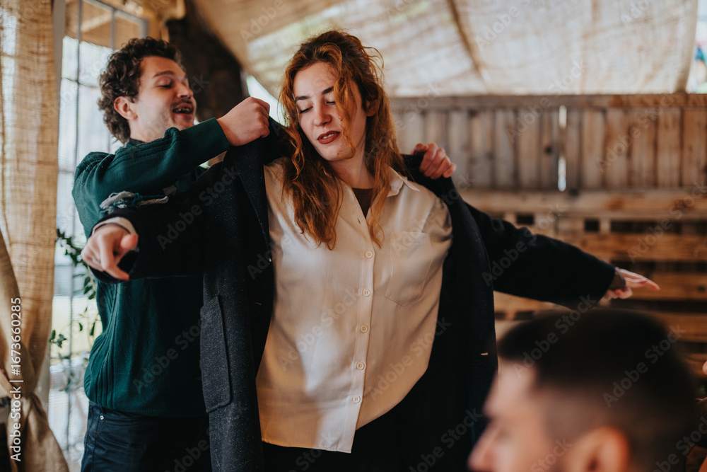 A cheerful moment between two friends bonding indoors with natural lighting and wooden decor.