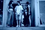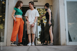 Three young adults engaged in a casual conversation by a modern building entrance, showcasing urban lifestyle and friendship on a sunny day.