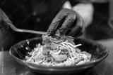 Chef plating Pad Thai in black bowl with shrimp, noodles, bean sprouts, peanuts, and cilantro garnish. Close-up of hands in gloves using tongs. Professional food presentation