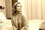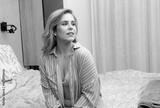 Young woman in striped shirt sitting on bed looking away in cozy bedroom