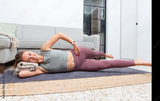 Young woman exercising on yoga mat at home with relaxed and happy expression