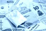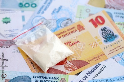 Nigerian naira currency money bills and cocaine pack. The concept of drug trafficking