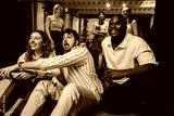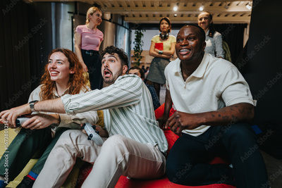 Young adults playing and enjoying a video game indoors in a casual and lively setting, expressing excitement and camaraderie.